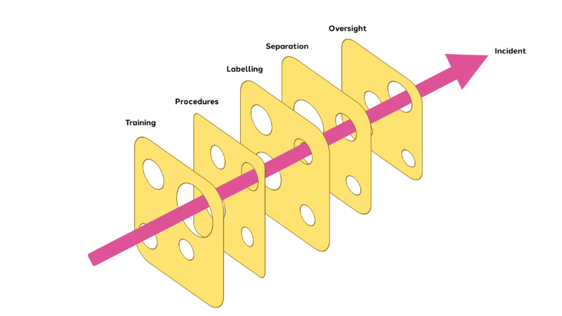 How small failures combine into serious incidents Safety experts often describe incidents like this using the Swiss Cheese Model. Every venue has layers of protection — training, procedures, labelling, oversight. Each is designed to stop something from going wrong. But no layer is perfect, and every layer has gaps. When those gaps align, a series of minor failures can combine into a serious incident.